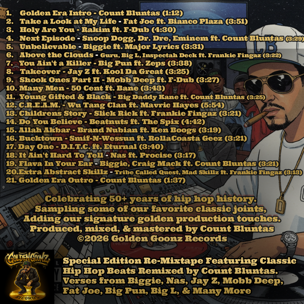 Produced, mixed, and mastered entirely by Count Bluntas, this project is both a tribute and a statement. Classic beats are respectfully reworked, signature Golden Goonz production touches are layered in, and timeless verses are given new life alongside fresh voices who understand the foundation they’re standing on.