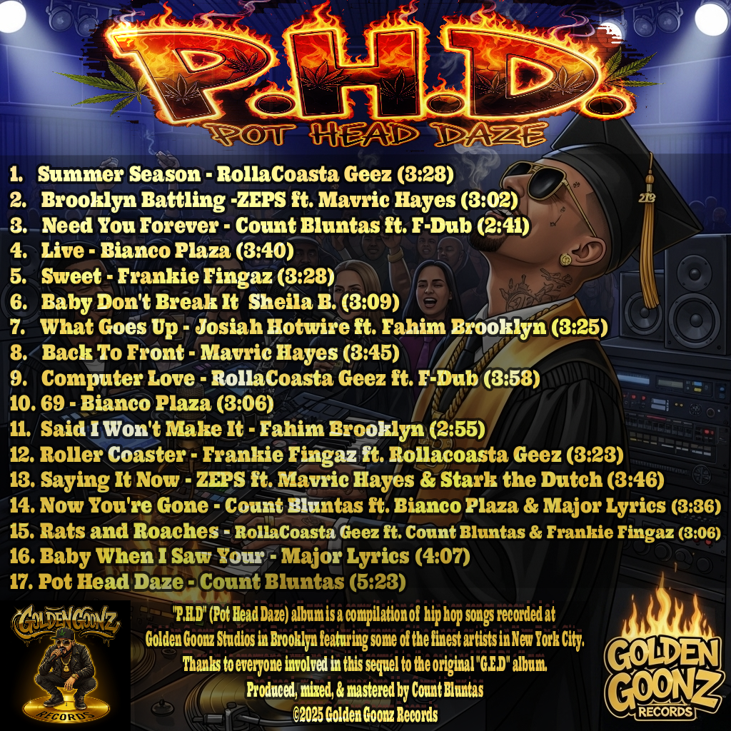 Golden Goonz Records officially steps into the spotlight with P.H.D. (Pot Head Daze), a compilation album curated and led by Count Bluntas. More than just a collection of tracks, P.H.D. plays like a manifesto—one that blends hazy late-night vibes with sharp lyricism, street wisdom, and a deep respect for hip-hop’s roots.